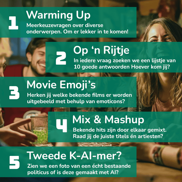 De Algemene PubQuizzen zijn een meeslepende mix van kennis, humor en uitdagende vragen. Van geschiedenis tot popcultuur, van wetenschap tot entertainment – wij hebben het allemaal voor je samengebracht in één bruisend pakket. Onze PubQuizzen onderscheiden zich door de verscheidenheid aan spelvormen. Geen eindeloze open vragen over één bepaald onderwerp, maar juist van multiple choice tot puzzelrondes en creatieve uitdagingen, elke quiz is een unieke reis vol verrassingen. Dit maakt de PubQuiz super afwisselend en leuk om te spelen!